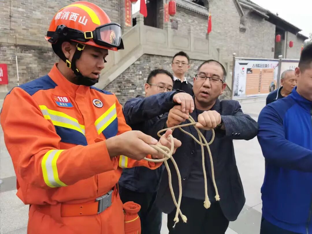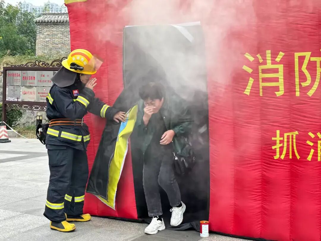 消防演练阶段,开发区消防救援大队专业人员现场向居民群众讲解消防器材使用方法,并进行绳结展示互动,引导居民沉浸式体验逃生屋,通过实战模拟演练,让居民亲身互动体验和学习应对措施,进一步提高自救互救的能力。